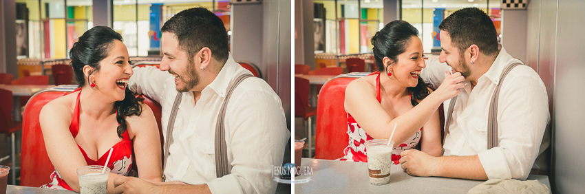 Alberto con una custom impecable y Ana, con una sonrisa permanente y llenar de color, decidieron dar protagonismo a su pre boda con un cierto aire retro entre batidos y paseos en moto.