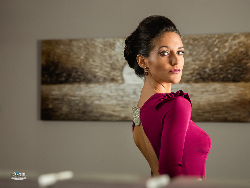 Sergio Luque (estilismo): «Nuestra modelo lleva un vestido largo de noche de manga larga en crepe de seda color berenjena con escote de espalda y broche de pedrería en cristal blanco. Sobre la manga se aprecia un pequeño volante, y en la parte trasera tiene una abertura hasta media pierna. Este color fue elegido ya que, por las características físicas de la modelo y tras realizar el test de color era el que mas luminosidad daba a su rostro. Como complementos lleva un clutch en platino, con cierre en plata; zapato de tacón descubierto en tono platino con hebilla lateral y pendientes de cristal y rodio en color berenjena.»